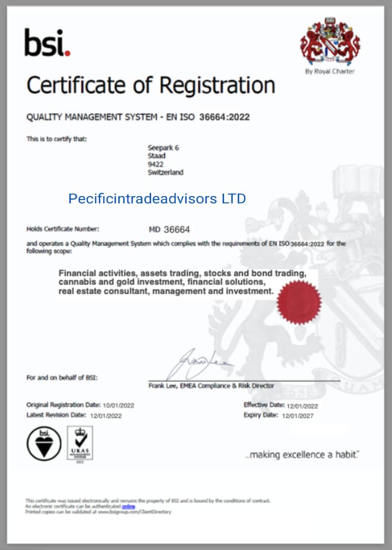 pecificintradeadvisors.org is Switzerland registered company, (ISO Number: 36664:2022,5, Avenue Theodore Flournoy Geneva, 1207 Switzerland.) we are assets trading platform, cannabis and gold investment company and also real estate investment that works automatically, and it has been registered in the Switzerland company, we offer a no-experience investment method to help you remove unnecessary risks. we are accept bitcoin, etherium, USDT.